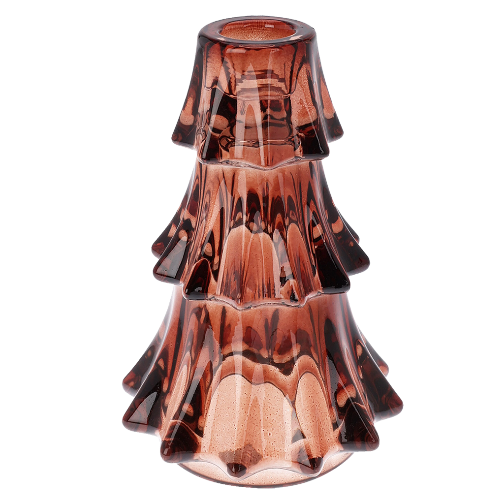 Deze prachtige glazen dennenboom kandelaar is het perfecte podium voor je mooiste kaarsen! Met zijn warme roodbruine gloed en speelse kerstboomvorm brengt hij instant feestsfeer in huis. En het mooiste? Hij is net zo mooi met als zonder kaars!