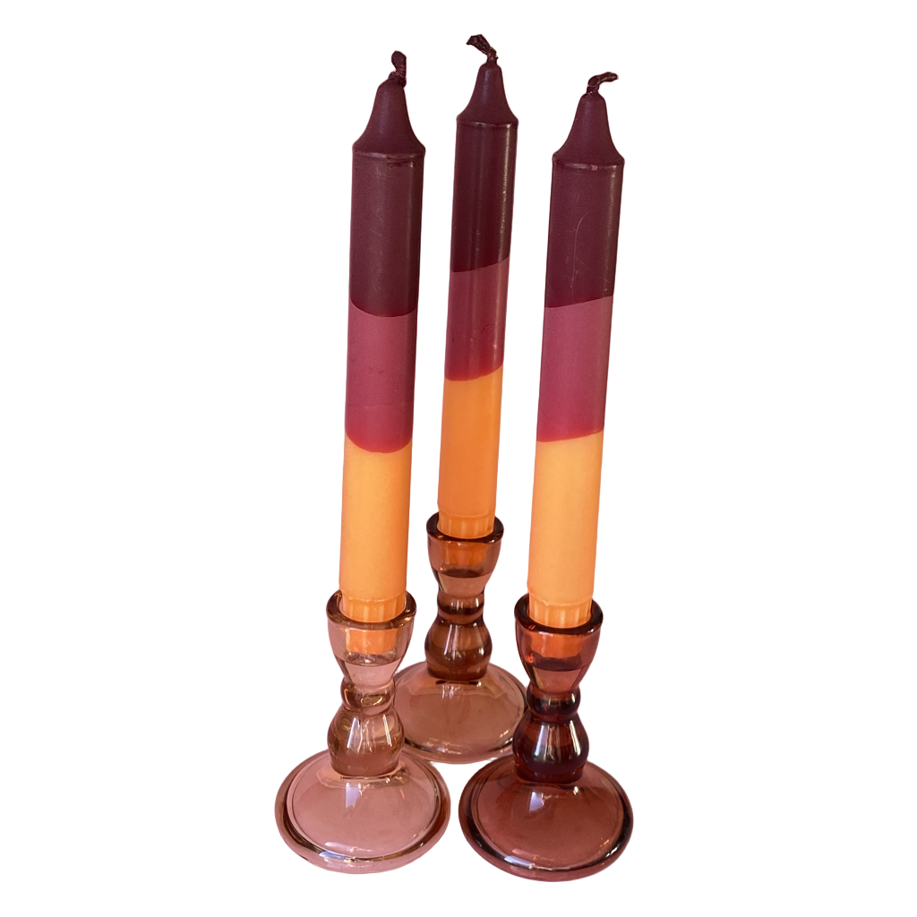 Vang het magische licht van het gouden uur met deze handgemaakte dip-dye kaarsen in warme oranje, zachte roze en diepe bordeaux tinten.