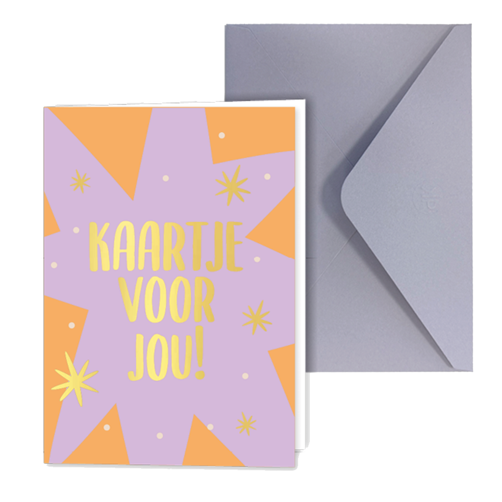 Soms heb je geen grote reden nodig om iemand blij te maken — een simpel kaartje kan al genoeg zijn. En met deze kleurrijke A6-wenskaart “Kaartje voor jou!” doe je dat meteen in stijl. Het speelse ontwerp met lila en perzikkleurige vlakken, vrolijke sterretjes en luxe gouden accenten maakt deze kaart een echte sfeermaker voor elke gelegenheid.
